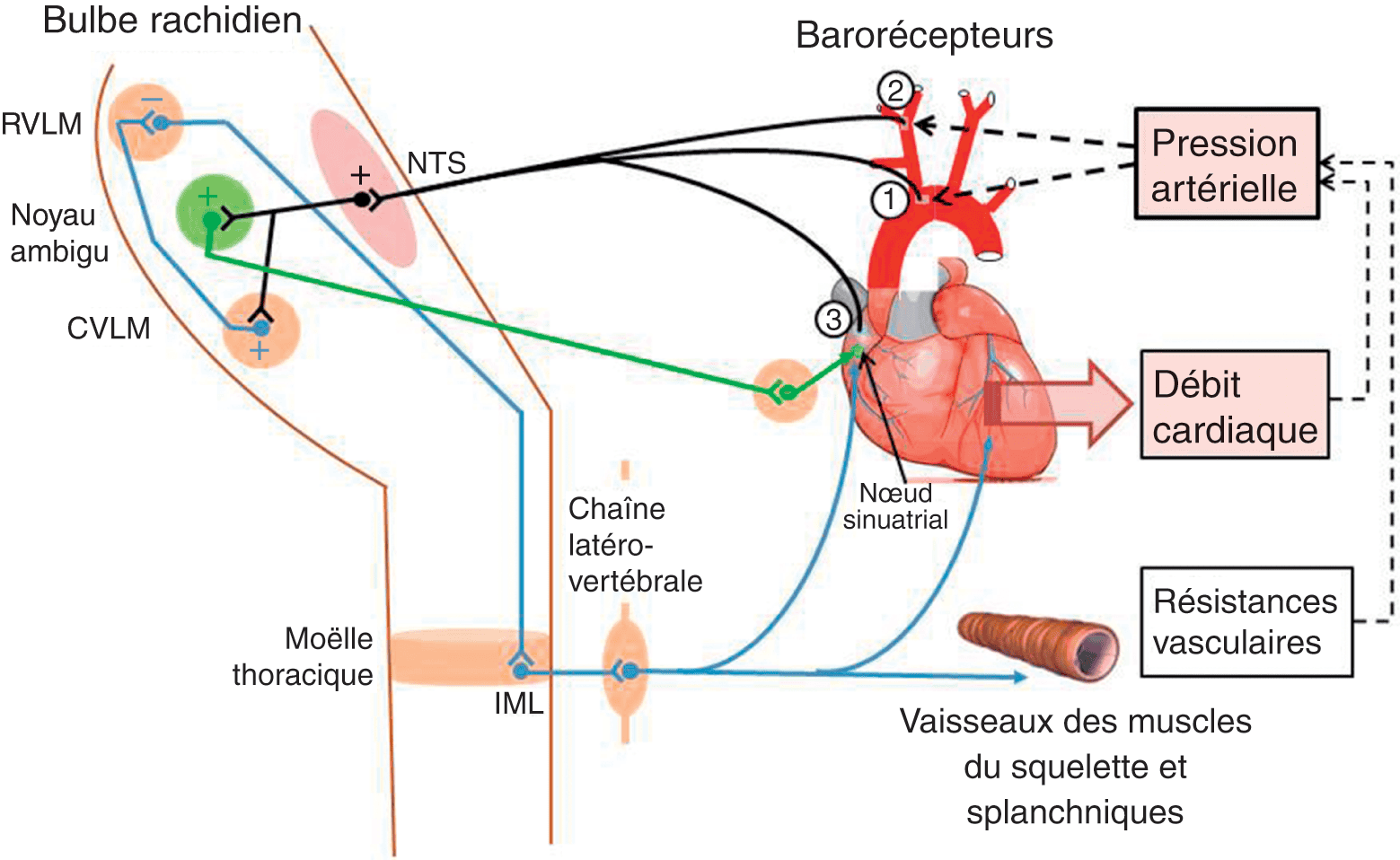 Le noyau ambigu envoie, par l’intermédiaire du nerf vague ou Xe paire crânienne, des neurones dits préganglionnaires vers des ganglions situés à proximité du cœur. Le neurone postganglionnaire innerve les cellules du nœud sinuatrial dont il module l’activité automatique par libération d’acétylcholine (système parasympathique, en vert). La RVLM envoie des neurones qui font relais avec les neurones préganglionnaires au niveau de la colonne intermédiolatérale (IML) de la moelle thoracique. Ces derniers font relais avec les neurones postganglionnaires au niveau de la chaîne latéro- (ou para-) vertébrale. Ces derniers innervent le nœud sinuatrial dont ils modulent l’activité automatique, tout le myocarde atrial et ventriculaire dont ils modulent la contractilité (via les récepteurs β1 adrénergiques) et les vaisseaux (artères et veines) de la grande circulation dont ils modulent le degré de constriction (via les récepteurs α1 adrénergiques), le tout via la libération de noradrénaline (système sympathique, en bleu). Voir détails du fonctionnement de la boucle dans le texte.