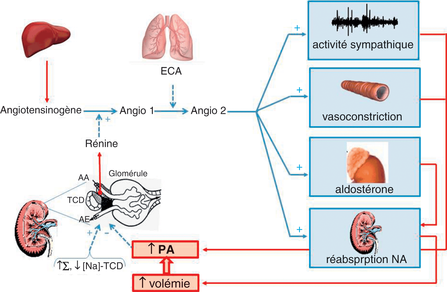 La rénine est une enzyme qui rencontre dans la circulation l’angiotensinogène d’origine hépatique qu’elle transforme en angiotensine 1, dépourvue d’effet tensionnel significatif. L’angiotensine 1 est transformée en angiotensine 2 sous l’effet de l’enzyme de conversion de l’angiotensine (ECA) principalement située à la surface des cellules endothéliales de la circulation pulmonaire. Les effets de l’angiotensine 2 sont liés essentiellement à sa fixation à ses récepteurs de type 1 (AT1R). Elle augmente la PA par plusieurs mécanismes :