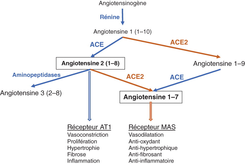La maladie à coronavirus apparue en 2019 (COVID-19) et son vecteur, le SARS-CoV-2 (Severe Acute Respiratory Syndrome-CoV-2) ont, de façon inattendue, focalisé l’attention sur un aspect volontiers négligé de la complexité du système rénine-angiotensine-aldostérone (SRA). Il s’agit des effets antagonistes de l’angiotensine 2 (Ang 1-8) et de l’angiotensine 1-7 (Ang 1-7) issue, entre autres, de l’angiotensine 1-8 sous l’effet d’une autre carboxypeptidase : l’enzyme de conversion de l’angiotensine de type 2 (ACE2). Or l’ACE2 est le récepteur membranaire de SARS-CoV-2, présent notamment sur les cellules épithéliales des alvéoles pulmonaires et les cellules endothéliales de la circulation. Il existe, de fait, un équilibre entre les effets de l’angiotensine 2 sur son récepteur AT1 et ceux de l’angiotensine 1-7 sur le récepteur MAS (Mas 1 proto-oncogene receptor), l’ACE2 jouant en outre un rôle de « clairance » de l’angiotensine 2. Nonobstant les éventuelles perturbations de cet équilibre induites chez les patients souffrant de COVID-19 traités par des antagonistes du SRA, l’on a craint que l’infection par SARS-CoV-2, en « consommant » l’ACE2, ne rompe cet équilibre au profit des effets potentiellement délétères de l’angiotensine 2 et au détriment des effets bénéfiques de l’angiotensine 1-7. Des essais thérapeutiques basés sur ces hypothèses et visant à augmenter l’activité ACE2 ont été lancés au cours de l’année 2020 (fig. 2.3).