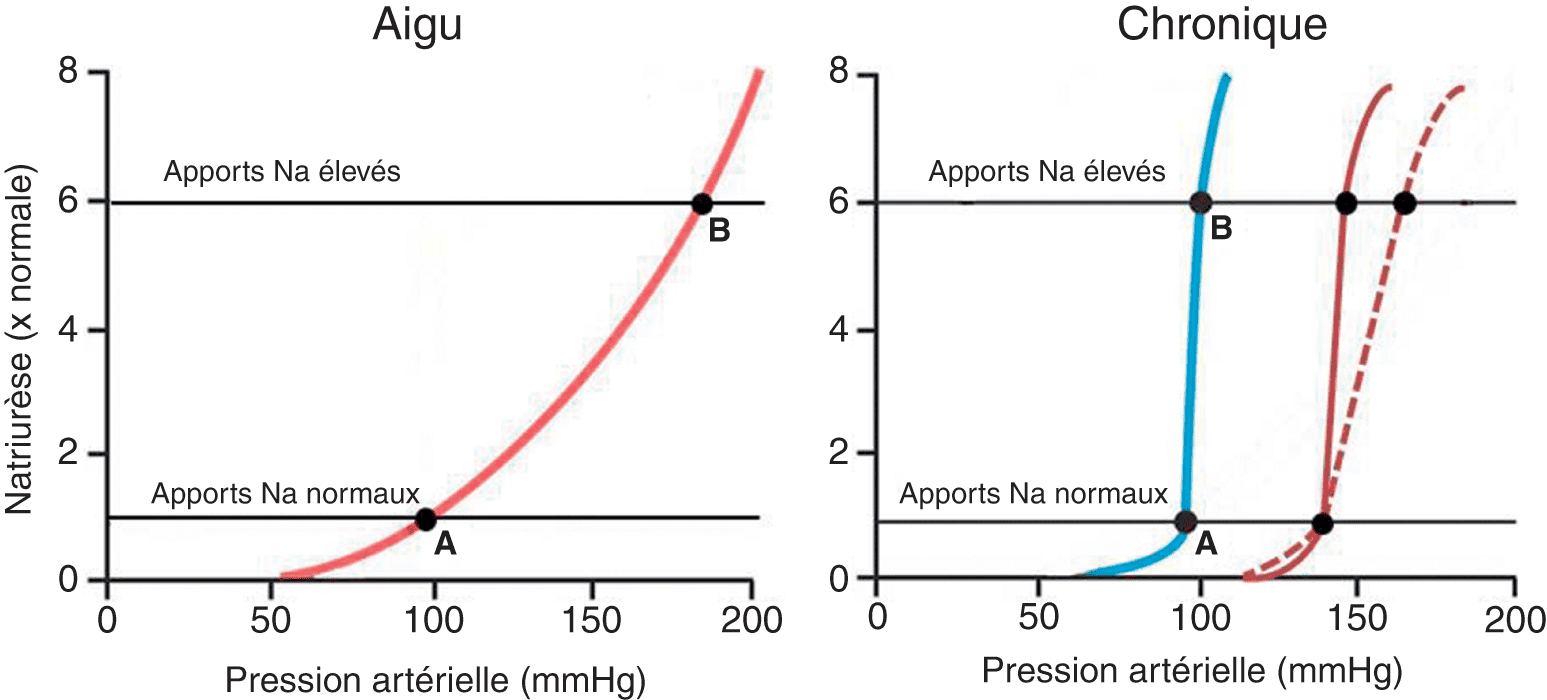 Par ailleurs, ce schéma montre que si les entrées de sel augmentent (droite noire horizontale « apports Na élevés »), le point d’équilibre se déplace vers la droite le long de la courbe rouge, de A à B, faisant ainsi augmenter la PA. Ainsi, si la courbe pression-natriurèse n’est pas verticale, la valeur à laquelle la PA est régulée dépend des apports sodés.