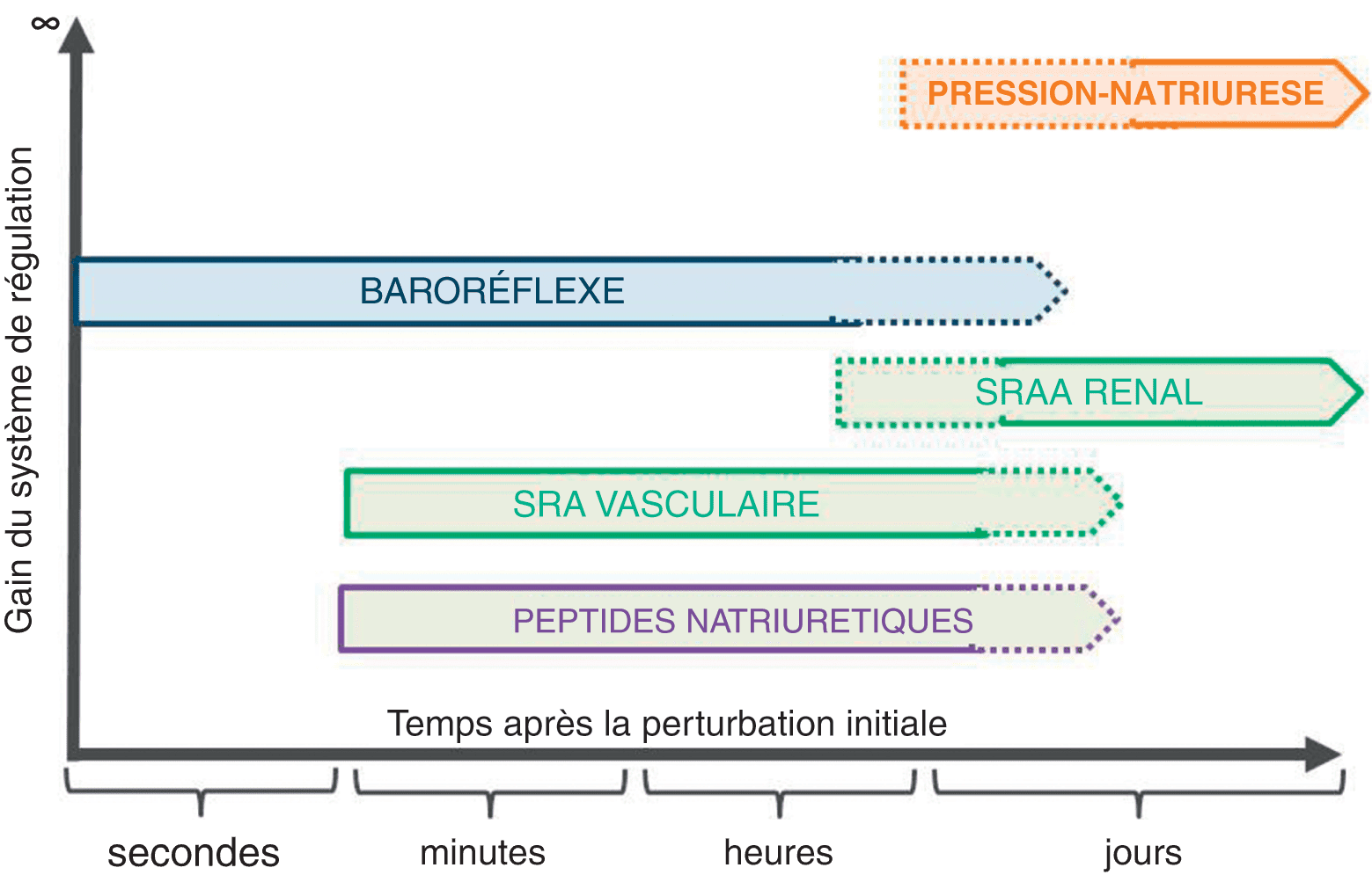 Les différents systèmes de régulation de la PA ont une complémentarité par leurs mécanismes d’action qui sont différents, tout en interagissant les uns avec les autres. En outre, ils ont une complémentarité via leurs cinétiques de mise en jeu. Sur la figure 2.6, en noir, le baroréflexe est le plus rapide à intervenir après une perturbation. En rouge, le phénomène de pression-natriurèse est le plus lent à se mettre en place. En ordonnée est représenté le gain, capacité du système à corriger plus ou moins complètement une perturbation initiale de la variable régulée. Dans la régulation de la PA, le seul système qui a un gain infini est celui représenté par la relation pression-natriurèse. Il faut noter enfin que ce chapitre n’a pas détaillé de façon exhaustive tous les mécanismes intervenant dans le contrôle de la PA, ceci étant au-delà des dimensions et de l’objectif du chapitre.