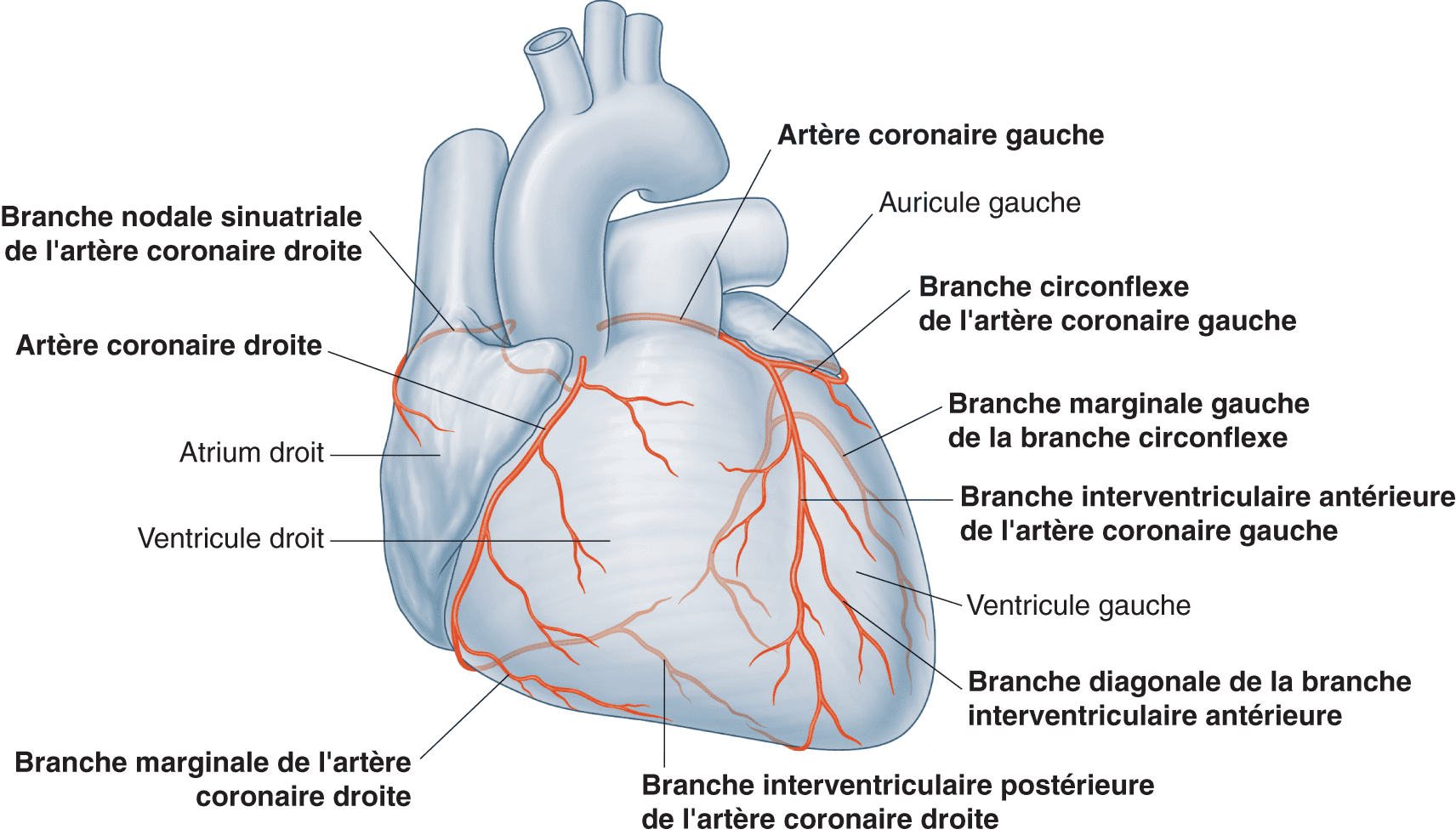 - L’artère coronaire gauche débute par le tronc coronaire et se divise en deux branches principales : l’interventriculaire antérieure et la circonflexe. La coronaire droite, en général moins développée que la gauche, se divise en interventriculaire postérieure et rétroventriculaire gauche.