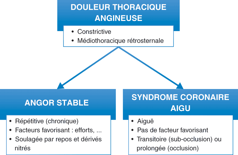 - La douleur de l’angor typique survient à l’effort dont elle impose l’arrêt et disparaît après l’arrêt de l’effort et/ou l’administration de trinitrine par voie sublinguale. La douleur révélant un infarctus myocardique est une douleur angineuse mais survenant habituellement au repos, prolongée (supérieure à 20 minutes) et non soulagée par la trinitrine.