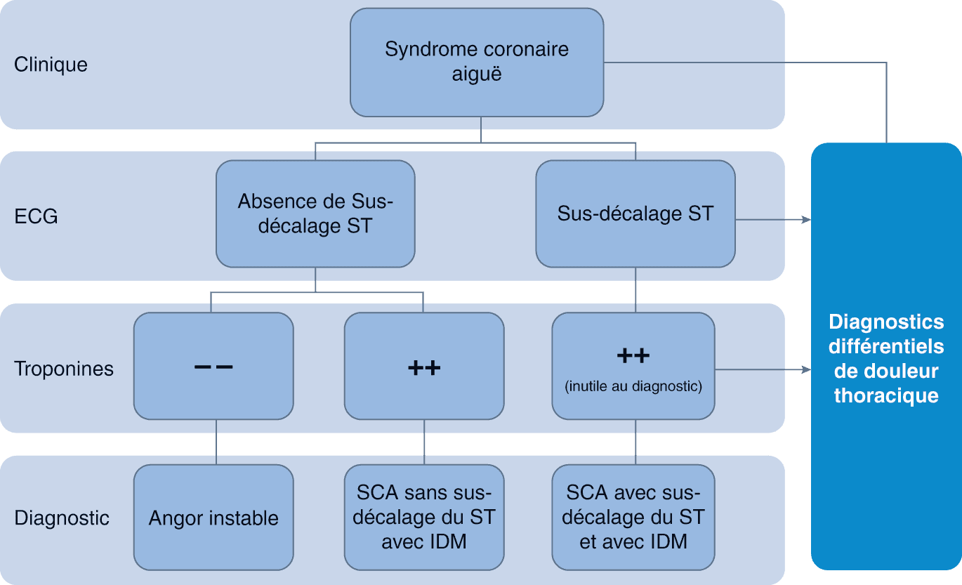 - L’électrocardiogramme d’un syndrome coronaire aigu doit distinguer la présence ou non d’un sus-décalage du segment ST (SCA STEMI versus non STEMI) correspondant à un territoire coronaire.