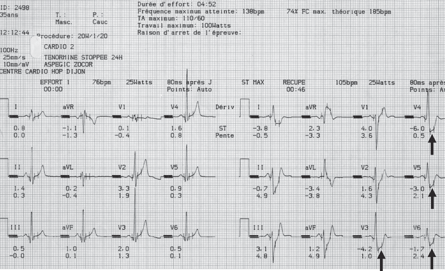 - Le principe général d’un test d’ischémie est de coupler les données cliniques (apparition d’un angor, intolérance hémodynamique), électrocardiographiques à l’effort (délai d’apparition de l’ischémie, hyperexcitabilité ventriculaire, bloc de branche gauche), avec des données morphologiques permettant de caractériser la topographie et l’étendue de l’ischémie myocardique.