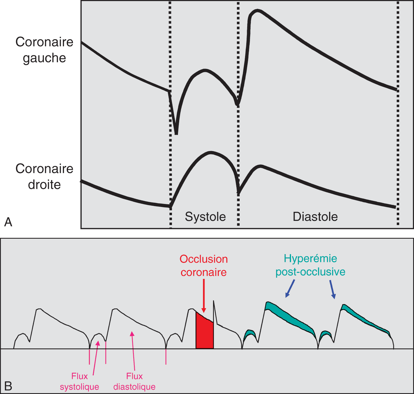 (A) On voit que le débit de la coronaire gauche est maximal en début de diastole. Ce débit est adapté aux besoins métaboliques du myocarde, et cette adaptation est très rapide, se faisant pratiquement de battement à battement. (B) Lorsque l’on interrompt le flux coronaire gauche pendant une diastole (occlusion coronaire, zone rouge), le déficit de débit est compensé par une augmentation des flux coronaire systolique et diastolique lors des battements suivants (hyperémie post occlusive, zone verte).