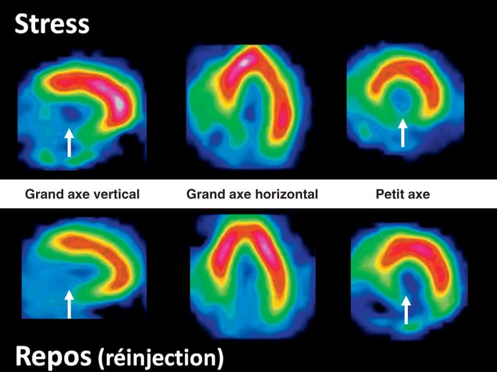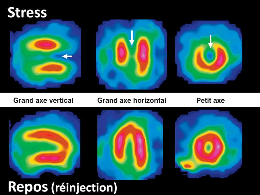 - Le test à la recherche de la documentation d’une ischémie couplé à une imagerie comporte l’échographie de stress, la scintigraphie myocardique de stress et l’IRM de stress.