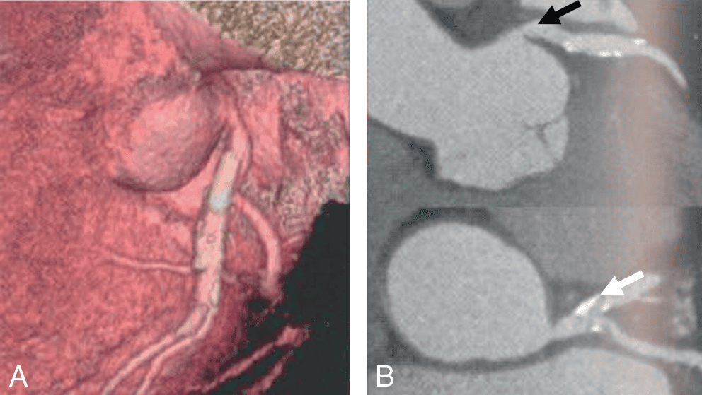Les anomalies de connexion des artères coronaires correspondent généralement à une artère coronaire qui se connecte d’un sinus autre que son sinus coronaire habituel. Il peut s’agir de l’artère coronaire droite qui naît du sinus coronaire gauche ou de l’artère coronaire gauche (ou de l’une de ses branches de division) au lieu du sinus coronaire droit. L’artère de connexion anormale va rejoint son trajet normal et cela peut avoir des conséquences physiopathologiques, en particulier lorsque la coronaire se positionne entre l’artère pulmonaire et l’aorte (risque de compression à l’effort notamment et donc de développement d’une ischémie myocardique).