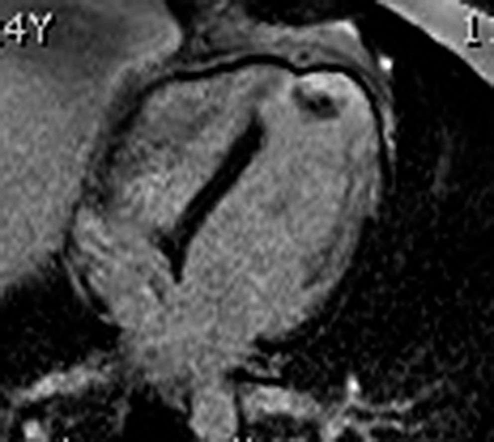 Ciné-IRM cardiaque, orientation grand axe vertical.Akinésie post-infarctus myocardique dans le territoire apical.