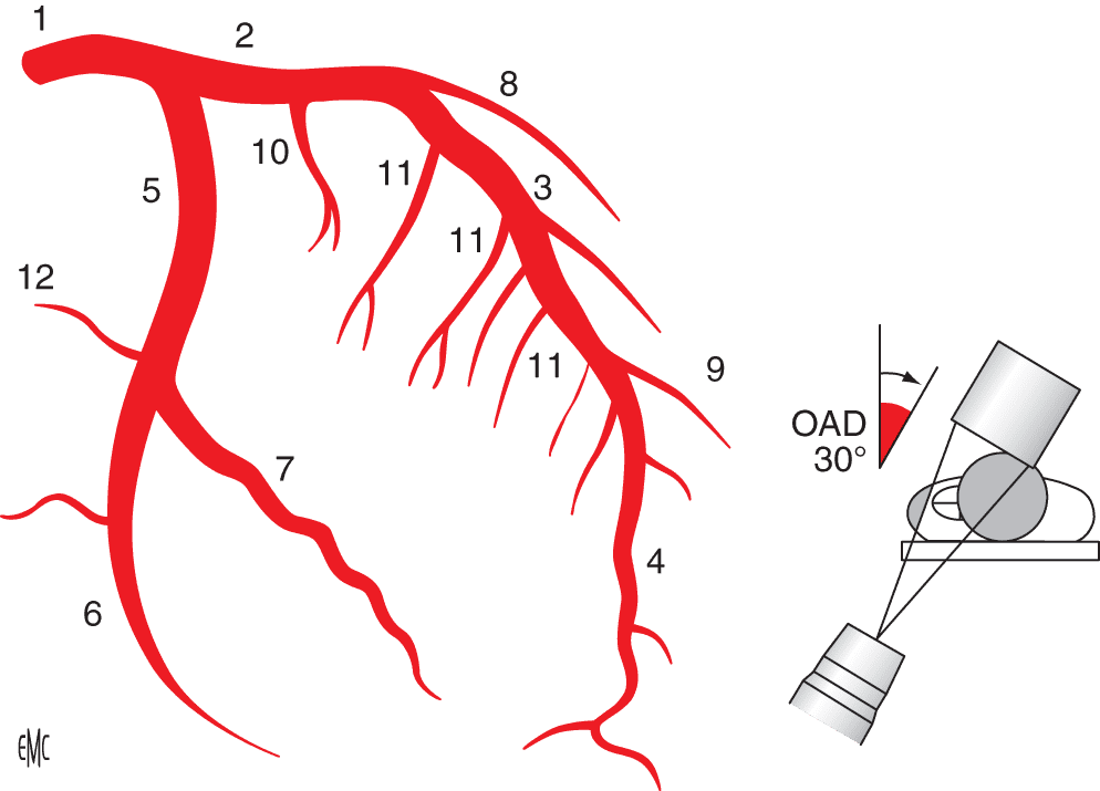 L’artère coronaire gauche est connectée au niveau du sinus de l’aorte (sinus coronaire gauche). Son trajet initial, appelé tronc commun, est le plus souvent très court, de 1 à 2 cm, entre tronc pulmonaire et auricule gauche. Elle se divise en une artère interventriculaire antérieure et une artère circonflexe.