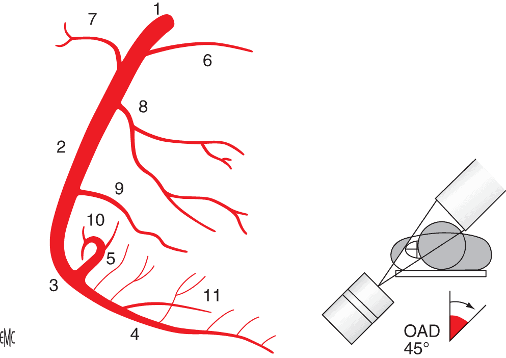La distribution dans les différents territoires myocardiques des artères coronaires (fig. 3.1) permet de comprendre la topographie des infarctus myocardiques et certaines de ses complications (cf. infra, Sémiologie) en fonction de l’artère siège de la thrombose aiguë :