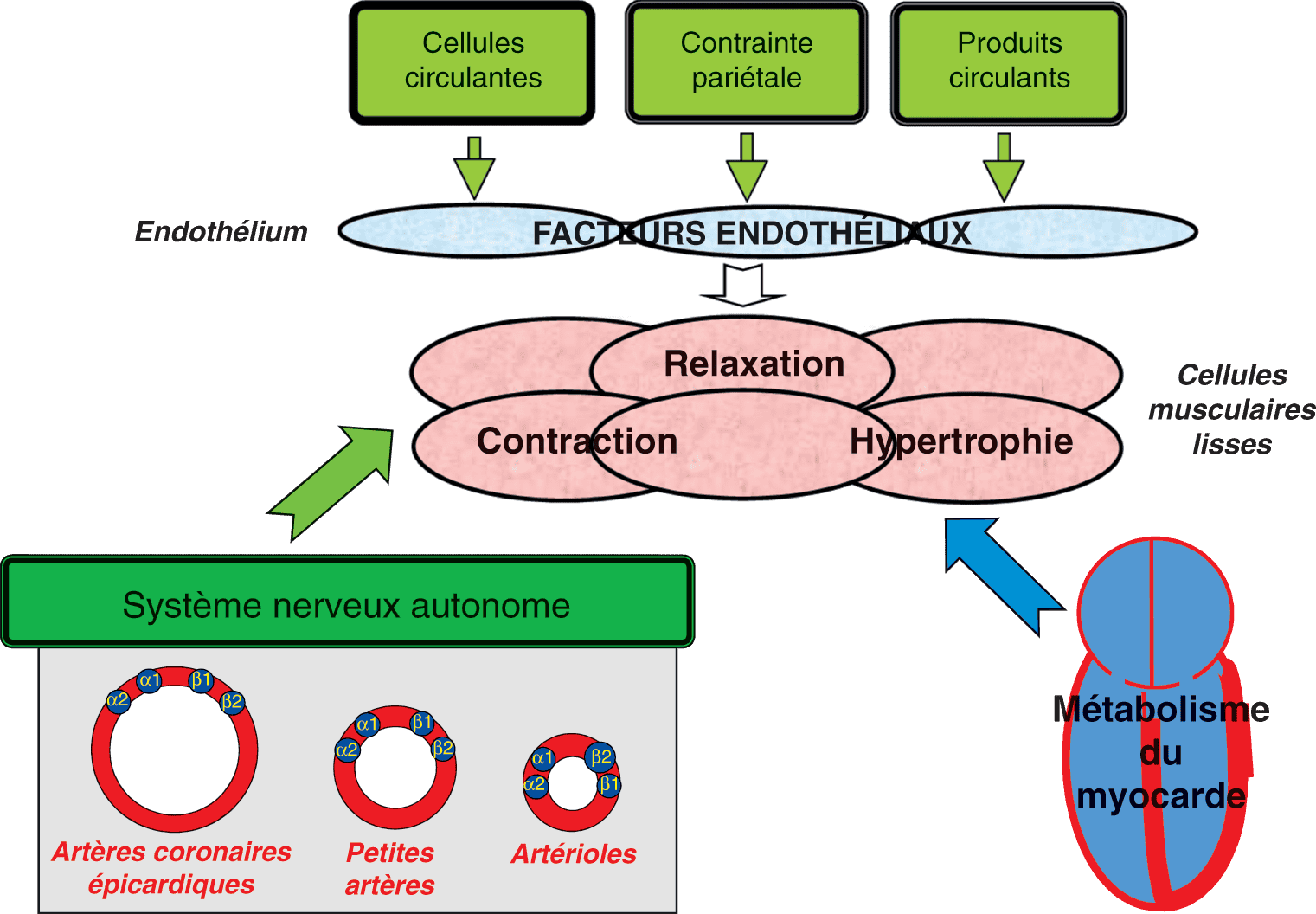 La vasomotricité coronaire (contraction, relaxation) est sous la dépendance de tois acteurs qui peuvent se suppléer les uns les autres : le métabolisme du myocarde, l’endothélium coronaire, et le système nerveux autonome. Elle permet l’adaptation du débit coronaire à la demande en oxygène du myocarde. Métabolisme du myocarde.