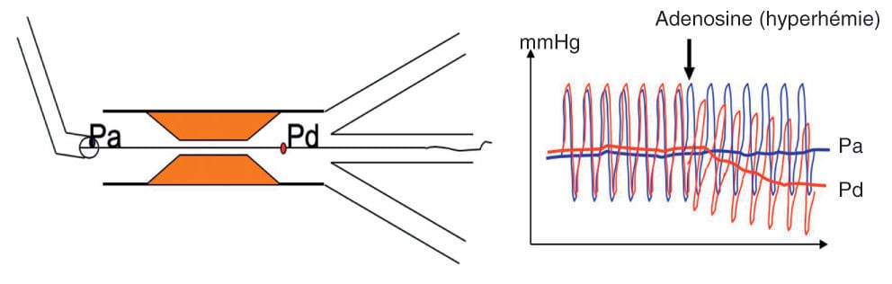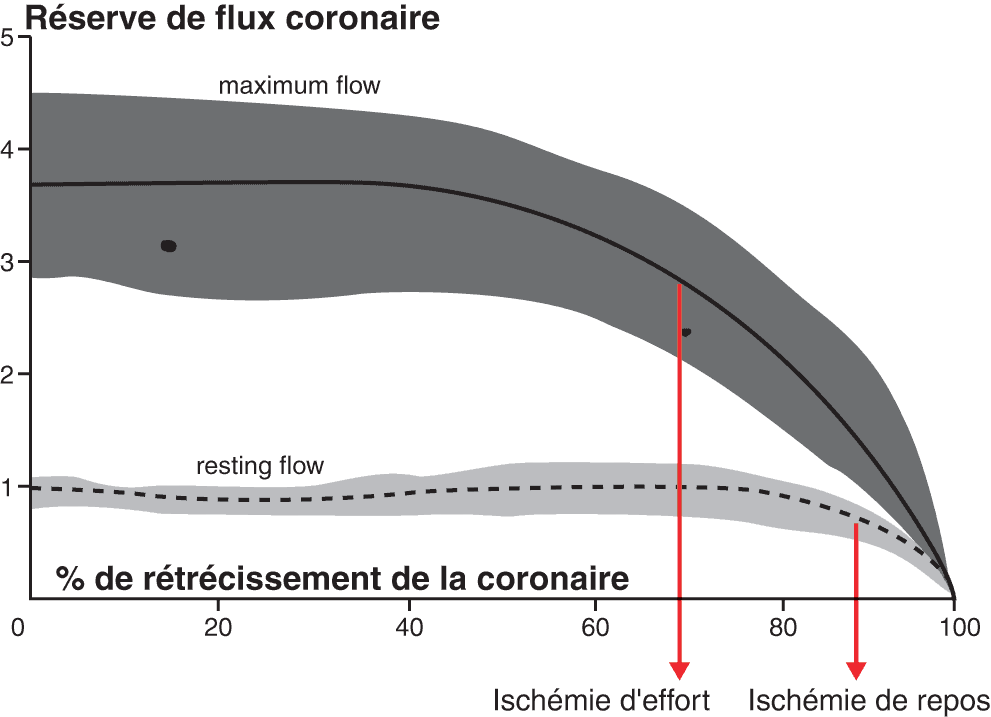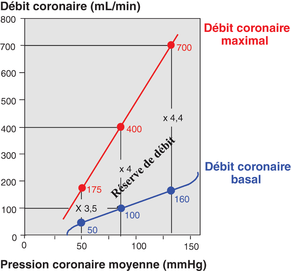 - La réserve de débit coronaire correspond à la capacité maximale de vasodilatation de la circulation coronaire pour une pression de perfusion coronaire donnée. La réserve de débit coronaire normal est comprise entre 3,5 et 4,5.