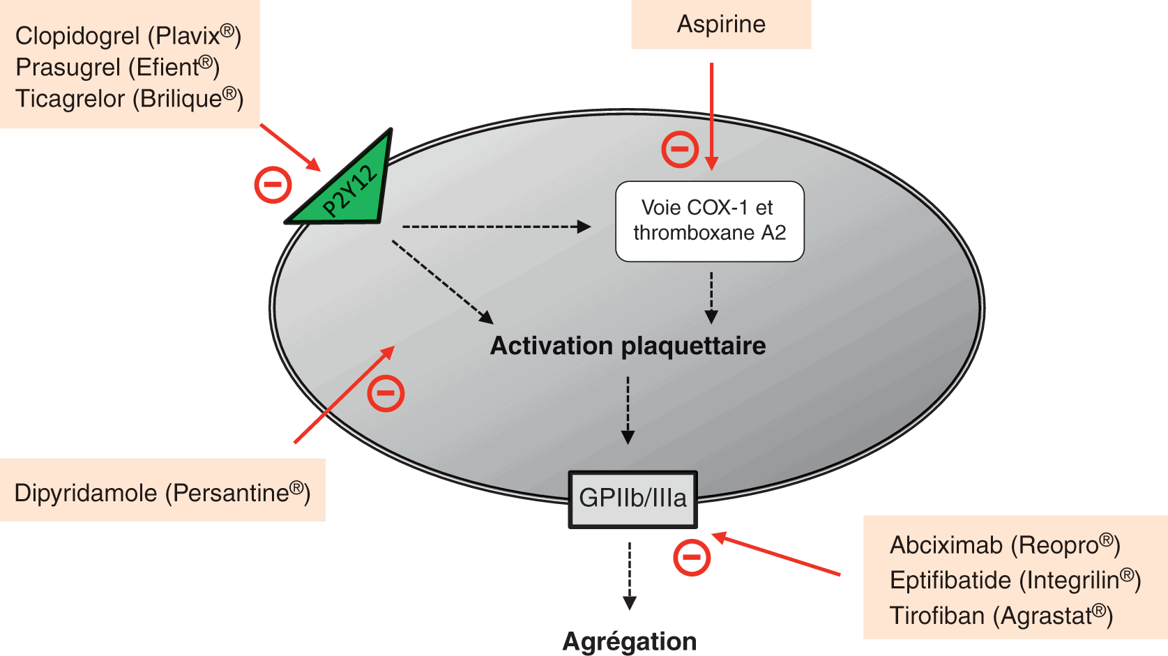 - Les bloqueurs du récepteur plaquettaire P2Y12 comprennent les molécules suivantes : clopidogrel, prasugrel, ticagrélor et cangrélor.