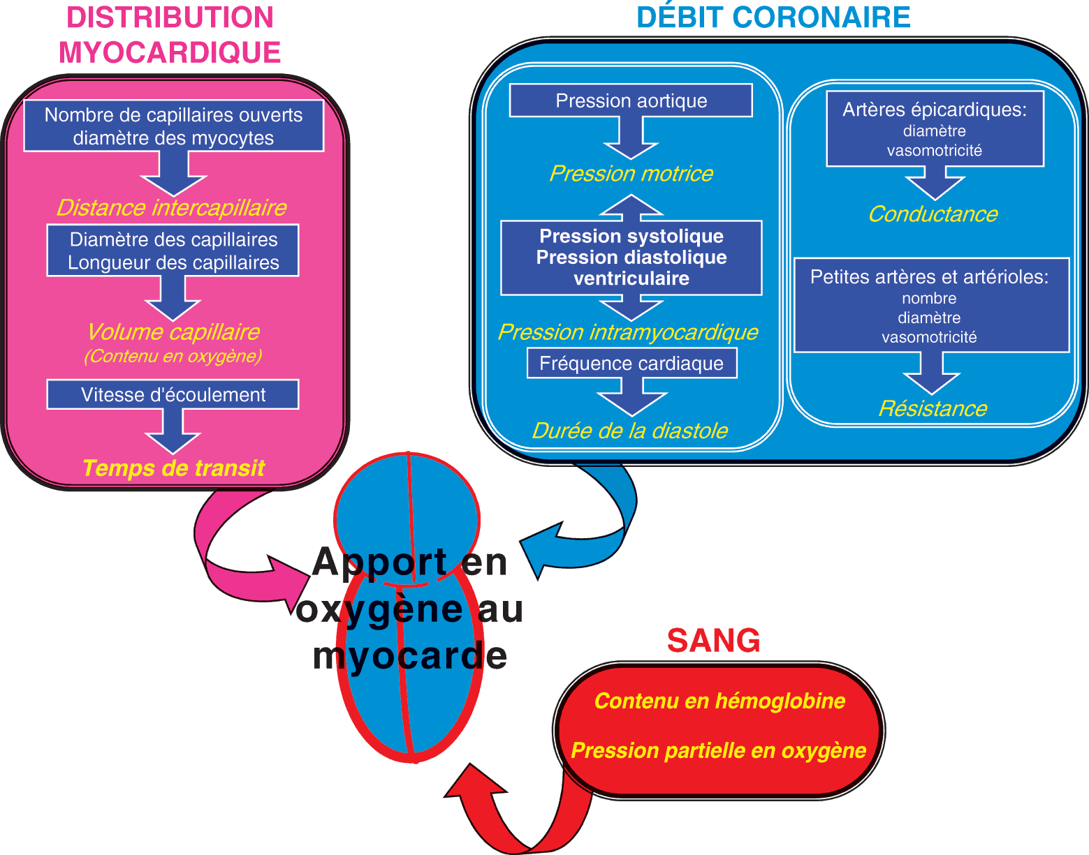 - Le métabolisme cardiaque est principalement aérobie. Le fonctionnement normal du cœur nécessite une production permanente d’ATP et donc des apports permanents et adéquats en O2 au myocarde. Le rôle de la circulation coronaire est d’assurer une bonne adéquation entre les besoins et les apports en O2 au myocarde. Les besoins en O2 vont augmenter avec la fréquence cardiaque, la contractilité du muscle cardiaque et la contrainte pariétale. Les apports en O2 vont varier en fonction de la teneur du sang en O2 et du débit coronaire. Dans des conditions physiologiques, la régulation du débit sanguin coronaire suit les fluctuations des besoins en O2 du muscle cardiaque. Cette adaptation se fait principalement par la régulation du débit sanguin myocardique grâce aux facteurs influençant la vasomotricité des artérioles coronaires (vasodilatation et vasoconstriction).