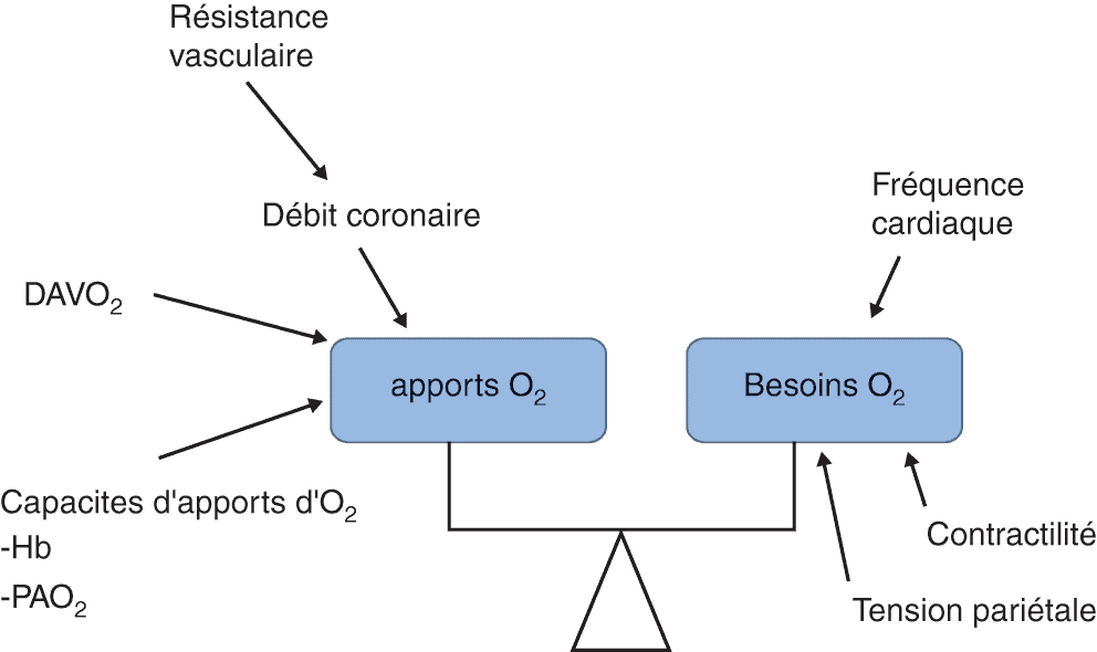 Le myocarde est un muscle strié dont la particularité, qu’il partage avec le diaphragme, est de n’être jamais au repos. La circulation coronaire est la circulation nourricière du myocarde. La finalité de celle-ci est d’apporter au myocarde les nutriments et l’oxygène (O2) destinés à son métabolisme qui est aérobie. Ce métabolisme produit les très importantes quantités d’ATP nécessaires à l’activité mécanique. La consommation d’O2 du myocarde est dépendante de trois paramètres : la fréquence cardiaque, la pression systolique et la contractilité du myocarde.