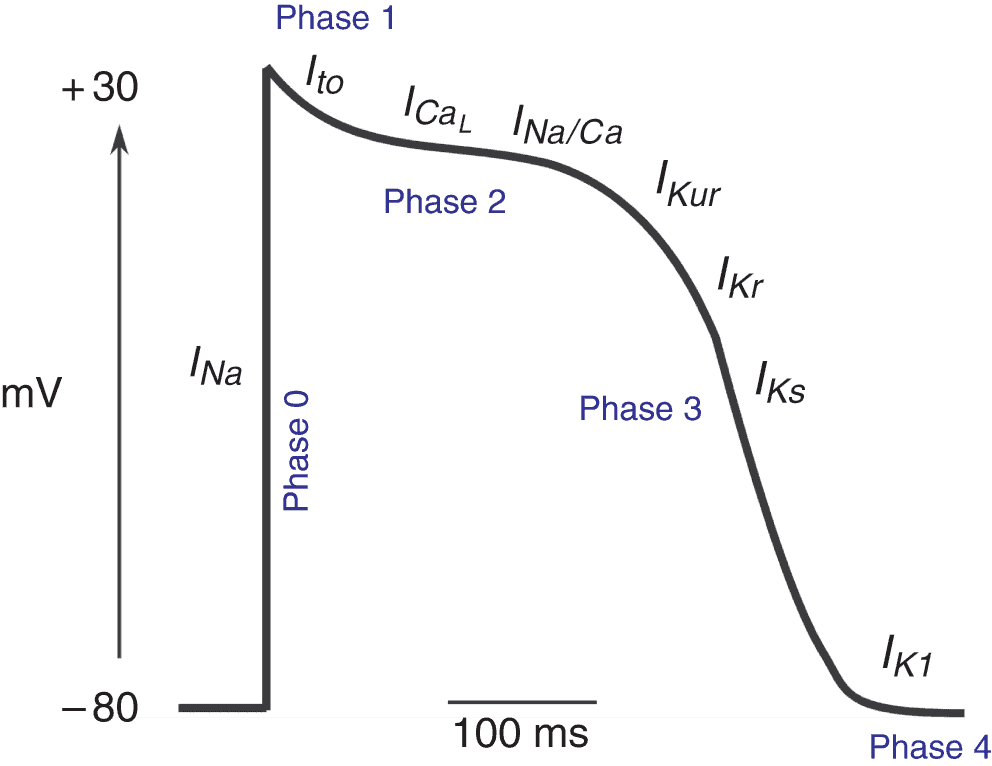 - Le potentiel d’action est constitué de cinq phases (de 0 à 4) et est la cible des traitements antiarythmiques.