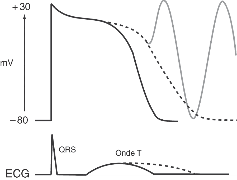 La conséquence de la baisse de l’activité de l’un des deux canaux potassiques repolarisants est un allongement du temps de repolarisation, donc du potentiel d’action cellulaire. Au niveau de l’ECG, la conséquence sera un allongement de l’espace QT. Le risque est la survenue de post-potentiels précoces (EAD) qui peuvent entraîner la survenue de torsades de pointes à l’origine de syncope ou de mort subite. INa : courant sodique dépolarisant ; Ito, IKr et IKs : courants potassiques repolarisants.