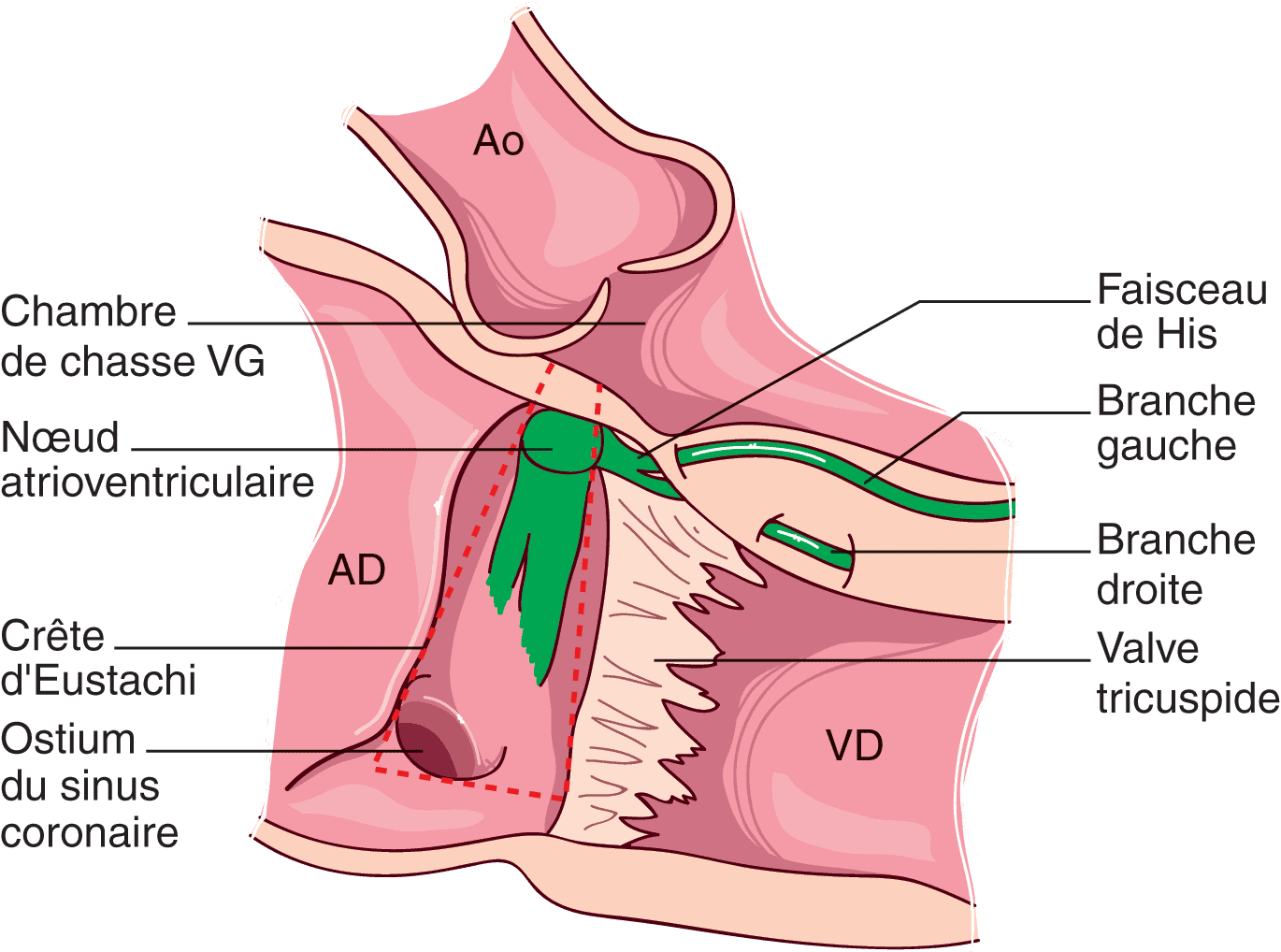 Situé à l’apex du triangle de Koch, représenté en pointillé rouge et délimité par la valve tricuspide, le sinus coronaire et la crête d’Eustachi. Remarquez les rapports du nœud atrioventriculaire avec la chambre de chasse du ventricule gauche et la valve aortique.