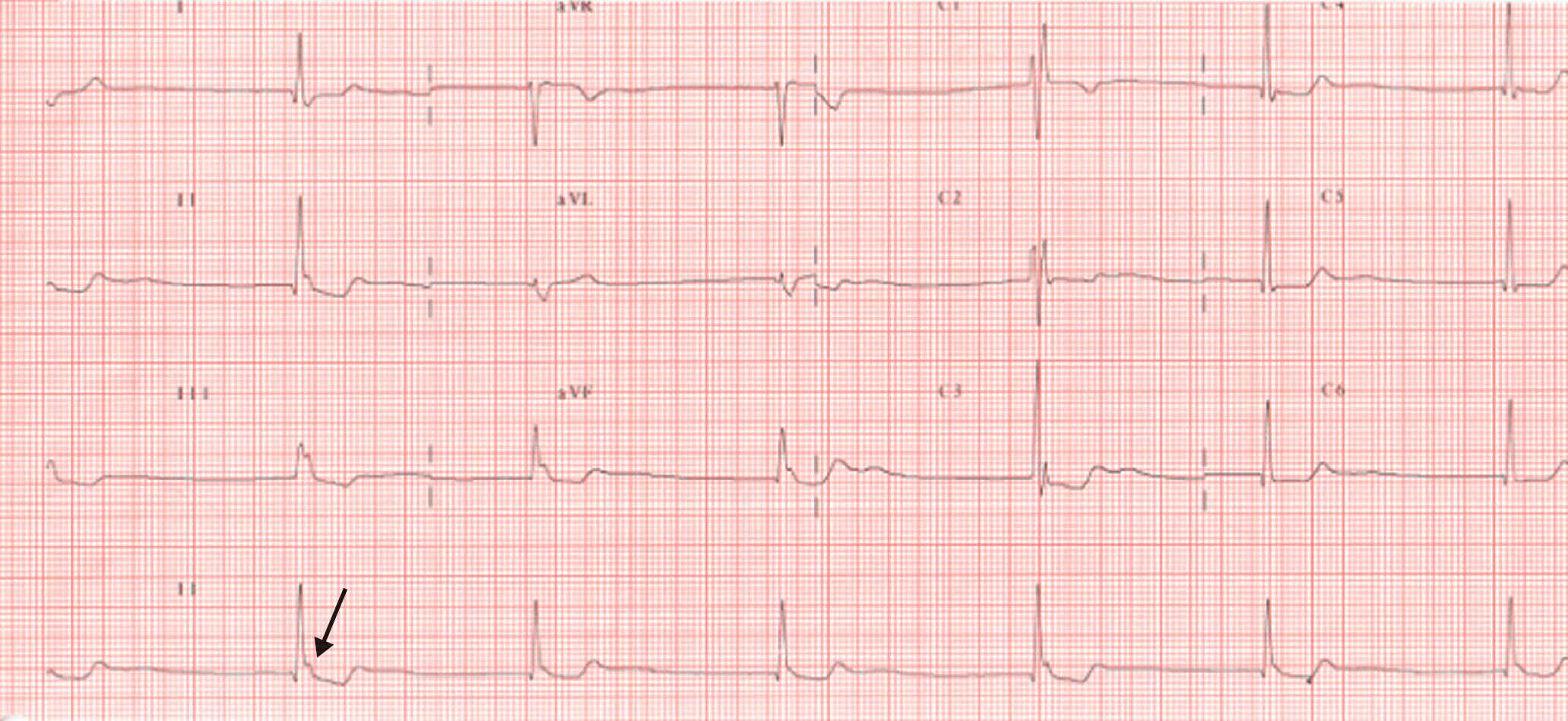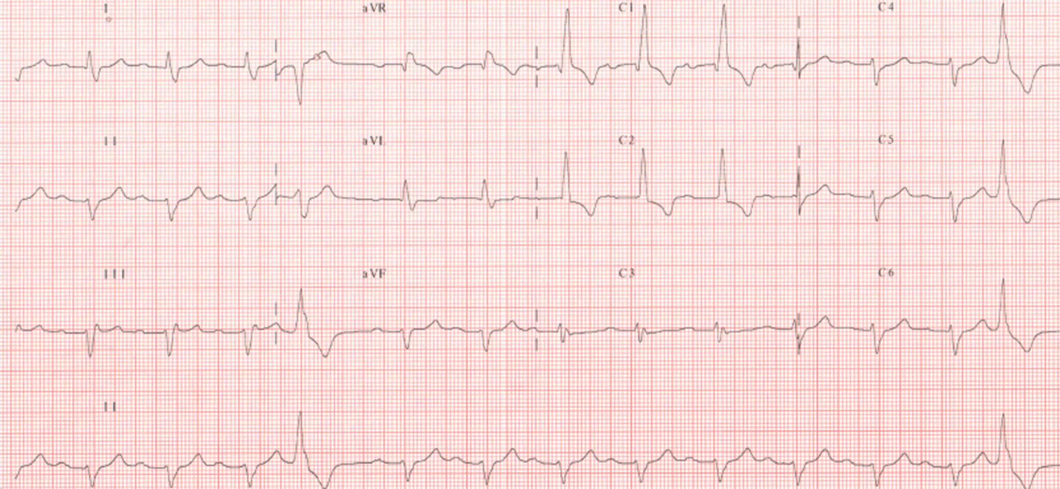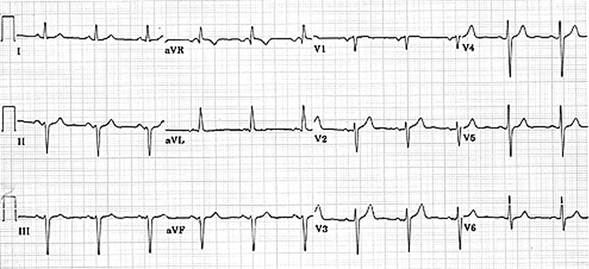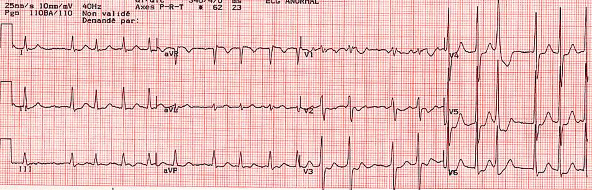 - Un ECG normal doit comporter une onde P avant chaque QRS ; un axe du cœur entre – 30° et + 120°, une onde P ≤ 120 ms, un espace PR ≤ 200 ms, un QRS ≤ 80 ms et un intervalle QT ≤ 440 ms.