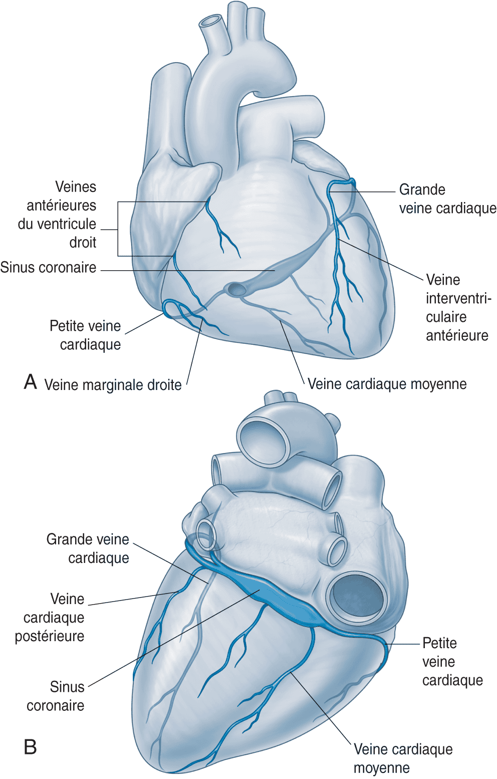 - la grande veine coronaire qui contourne l’anneau mitral par sa face postérieure (elle-même formée des veines antérieures et des veines latérales) ;
