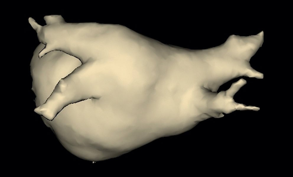 Figure 6.5. Reconstruction tridimensionnelle d’un scanner de l’atrium gauche, permettant de voir l’abouchement des deux veines pulmonaires gauches et des deux veines pulmonaires droites.