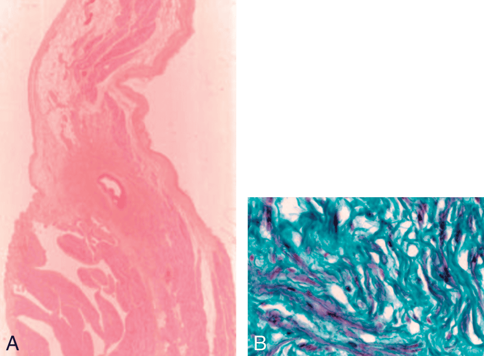 A. Le nœud sinusal centré par l’artère du nœud sinusal (coloration HES ; × 40). B. Cellules du nœud sinusal au sein du réseau conjonctif (coloration trichrome de Masson ; × 400).