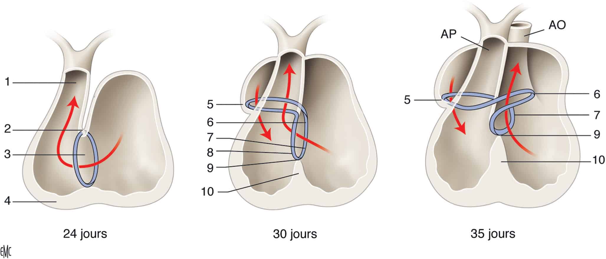 AO, aorte ; AP, artère pulmonaire. 1. Anneau atrioventriculaire droit. 2. Zone du nœud atrioventriculaire. 3. Tronc du faisceau de His. 4. Branche septale. 5. Bifurcation du faisceau de His. 6. Septum interventriculaire. 7. Conotruncus. 8. Anneau primitif. 9. Courbure externe. 10. Courbure interne.