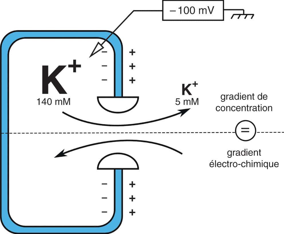 Cette cellule a un potentiel de membrane de – 100 mV. La quantité d’ions potassium entrant dans la cellule par le gradient électrochimique est égale à la quantité d’ions potassium sortant de la cellule par le gradient de concentration. Le bilan est nul, il s’agit du potentiel d’équilibre de l’ion (à condition qu’il n’y ait pas d’autres canaux laissant passer un autre ion).