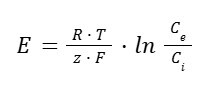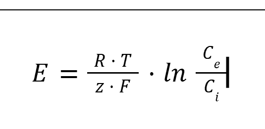 L’équation de Nernst donne le potentiel d’équilibre E pour un ion donné (en mV), en fonction de Ce, concentration à l’extérieur de la membrane de l’ion considéré (en mM), et Ci, concentration à l’intérieur de la membrane de l’ion considéré (en mM) :