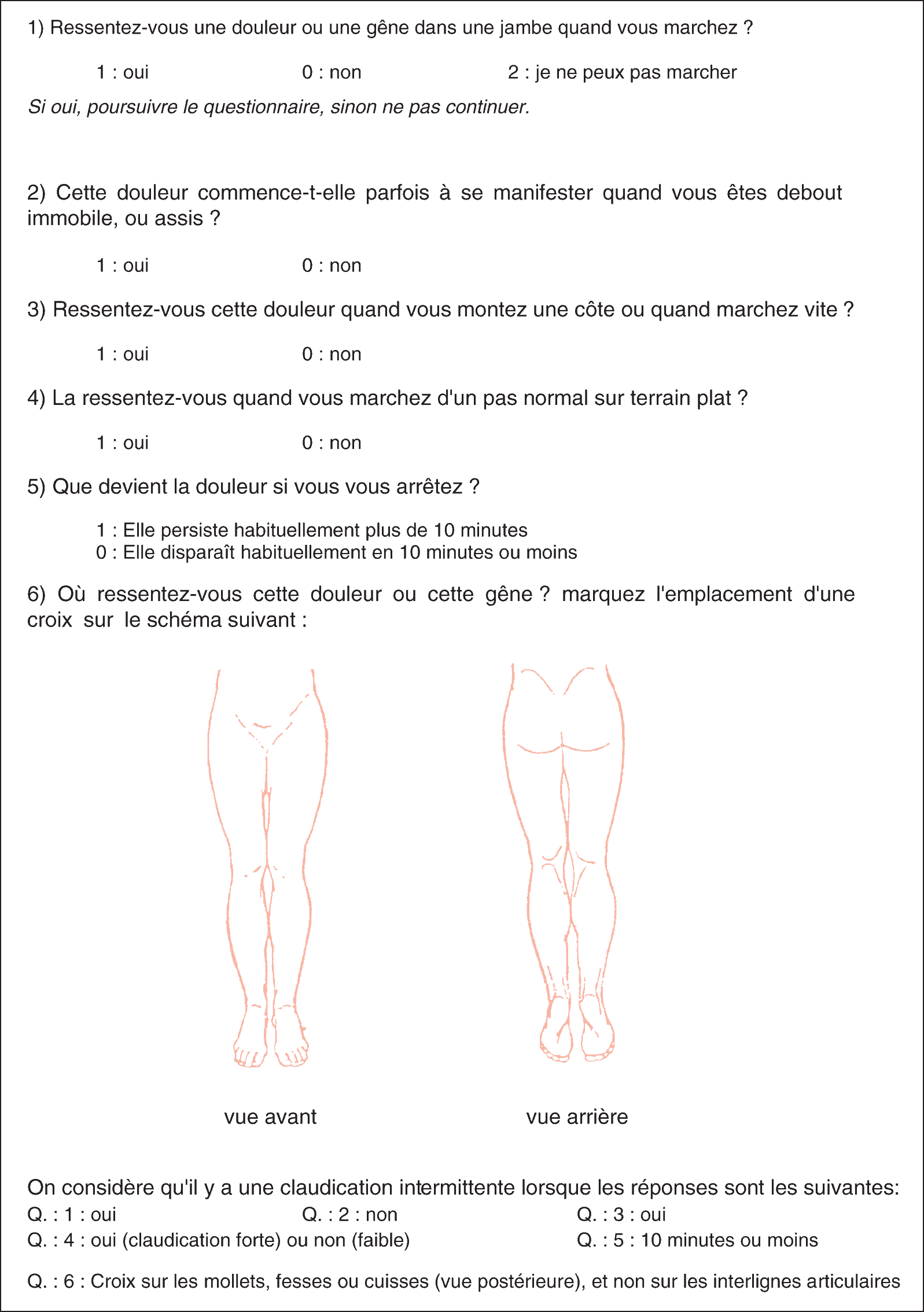 On estime à plus de 200 millions le nombre d’individus affectés par l’AOMI dans le monde (et environ 1 million en France). Cette estimation inclut non seulement les formes cliniques de la maladie mais également sa forme infraclinique, diagnostiquée notamment par la mesure de l’index de pressions systolique (cf. infra). Cette maladie est très rare avant 40 ans, et augmente de manière exponentielle à partir de 65 ans, tant chez l’homme que la femme, atteignant près de 20 % de la population après 80 ans. On estime de 1/5 à 1/3 la proportion de la population affectée par la forme symptomatique de cette maladie, les autres ayant une maladie asymptomatique. Les symptômes sont essentiellement sous forme de claudication intermittente (cf. infra). Ainsi, des questionnaires ont été développés, ayant pour but de détecter cette maladie à partir des symptômes de claudication intermittente. Parmi eux, le questionnaire d’Édimbourg a été traduit et utilisé en France (fig. 7.1). La prévalence de la claudication intermittente est de l’ordre de 3-5 % après 60 ans.