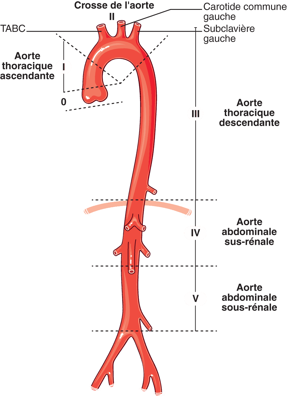 L’aorte (fig. 7.2) naît du ventricule gauche au niveau de la chambre de chasse et décrit un arc à concavité inférieure avant de descendre dans le thorax puis dans l’abdomen. Son calibre initial est d’environ 30 mm.