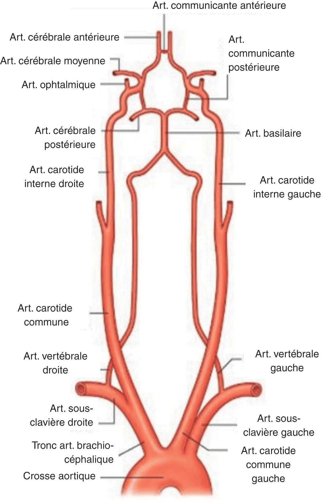 La perfusion sanguine cérébrale est assurée par les artères carotides et le système vertébro-basilaire (fig. 7.3). Les deux artères carotides forment la circulation antérieure, les deux artères vertébrales se réunissent en un tronc basilaire formant ainsi la circulation postérieure. On décrit un réseau anastomotique plus ou moins bien développé selon les individus. Il existe une anastomose entre les deux systèmes carotides via l’artère communicante antérieure ainsi qu’une anastomose entre les artères carotides et le tronc basilaire via les artères communicantes postérieures. L’ensemble de ce réseau anastomotique constitue le polygone artériel de Willis. Il existe d’autres réseaux anastomotiques, en particulier à la partie la plus distale des territoires artériels. L’ensemble de ces réseaux contribue à une protection maximale du parenchyme cérébral.