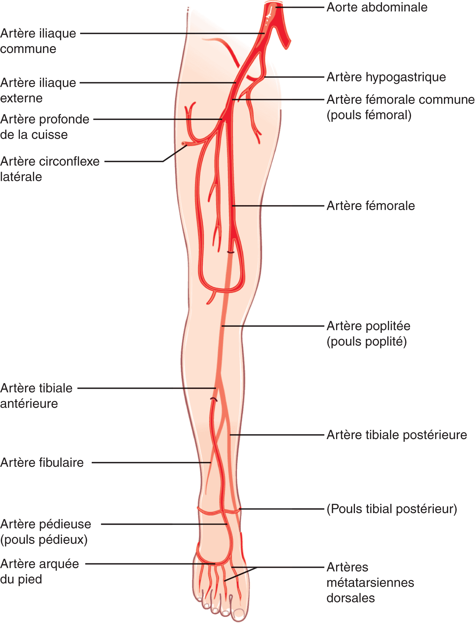- l’artère fémorale (ou artère fémorale superficielle), qui chemine dans la cuisse le long du canal fémoral et se prolonge en artère poplitée au-dessus du genou.