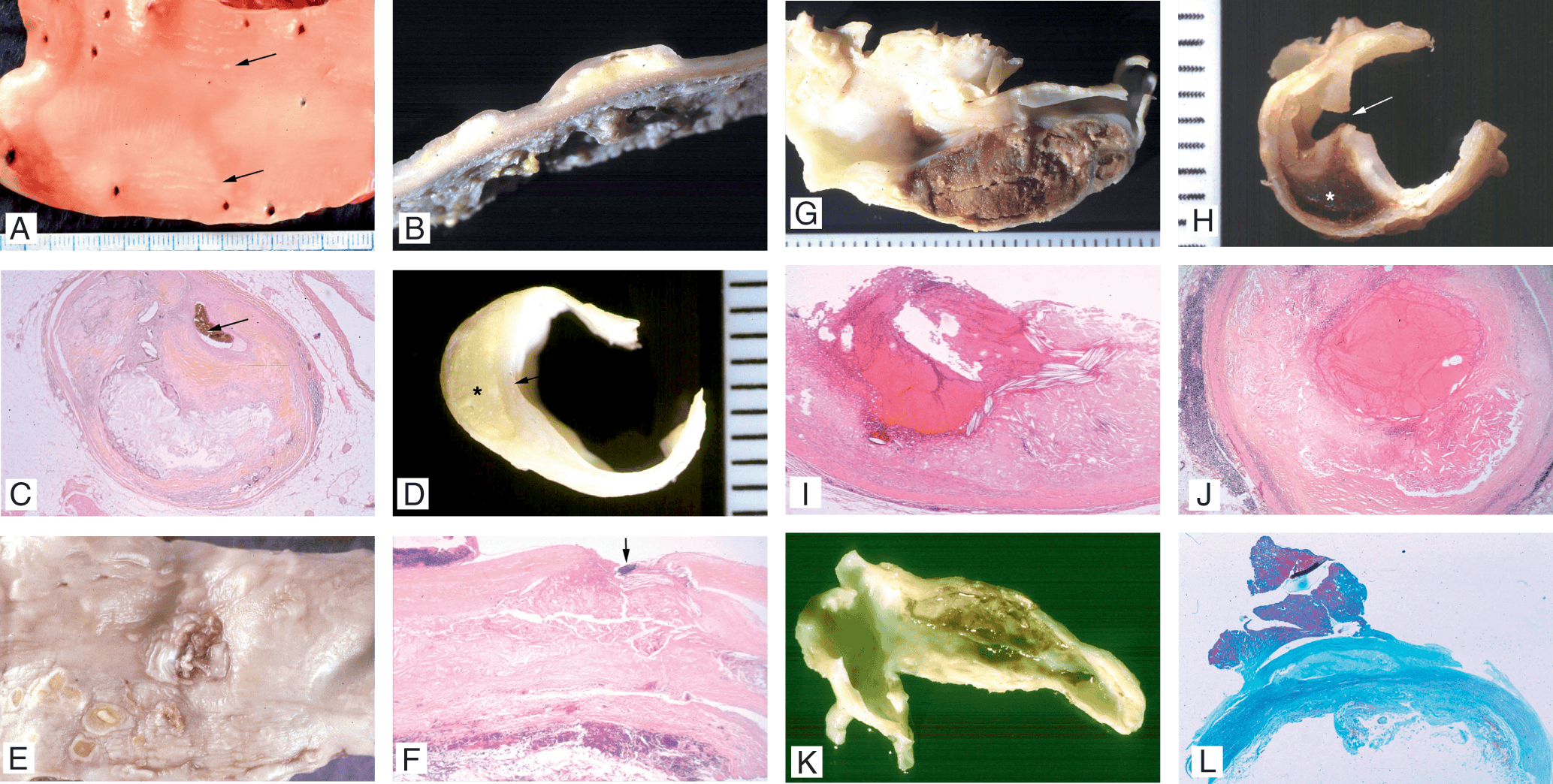 A. Aorte d’un sujet jeune ouverte longitudinalement. Présence de stries lipidiques (flèches) : il s’agit de lésions linéaires parallèlement au flux sanguin, jaunâtres, sans relief. B. Coupe d’une plaque d’athérosclérose aortique : lésions en relief constituées d’un centre lipidique jaunâtre surmonté d’une chape fibreuse. Il s’agit de la plaque fibro-lipidique non compliquée. C. Plaque d’athérosclérose sur une coronaire épicardique. Cette lésion est constituée d’un centre lipidique et d’une chape fibreuse épaisse. La lumière résiduelle est fortement sténosée (flèche). D. Plaque d’athérosclérose carotidienne. Il s’agit d’une plaque fibro-lipidique non compliquée avec un centre lipidique (étoiles) et en surface une chape fibreuse (flèche) lisse non ulcérée. E. Aorte d’un sujet âgé ouverte longitudinalement. Présence de multiples plaques d’athéroscléroses pour la plupart ulcérées apparaissant comme des cratères brunâtres. F. Coupe histologique d’une plaque athéroscléreuse aortique compliquée d’ulcération. La perte de substance (flèche) fait disparaître la chape fibreuse et expose le centre lipidique au sang circulant. G. Coupe longitudinale d’une bifurcation carotidienne. La paroi du bulbe carotidien est épaissie occupée par un volumineux hématome intraplaque. Cet hématome sténose fortement la lumière de la carotide. H. Coupe transversale d’une carotide interne. Présence d’une plaque d’athérosclérose compliquée d’une part d’ulcération (flèche) et d’autre part d’hématome intraplaque (étoile). I. Plaque d’athérosclérose carotidienne vue en histologie à faible grossissement. La plaque est ulcérée et la perte de substance est recouverte par un thrombus récent mural n’occluant pas totalement la lumière. J. Plaque d’athérosclérose sur une artère coronaire épicardique coupée transversalement. La lumière est occluse par un thrombus compliquant une plaque d’athérosclérose. K. Bifurcation carotidienne coupée longitudinalement. Sur le bulbe carotidien, il existe une plaque d’athérosclérose compliquée de thrombose murale. L. Plaque d’athérosclérose de la crosse aortique vue en histologie à faible grossissement. Il s’agit d’une plaque fibro-lipidique compliquée d’un volumineux thrombus pédiculé saillant dans la lumière aortique. Ce thrombus était la source d’embolies cérébrales.