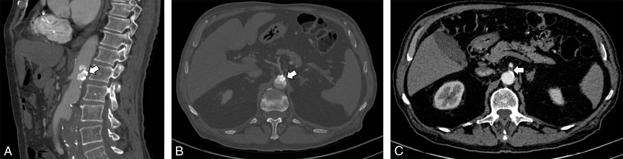 - les artères à destinée viscérale : le tronc cœliaque (en regard du disque T12-L1, donnant trois branches terminales : l’artère hépatique commune, l’artère gastrique gauche et l’artère splénique), l’artère mésentérique supérieure (qui naît au niveau de L1 au-dessus des artères rénales) et l’artère mésentérique inférieure (au niveau de L3) ;