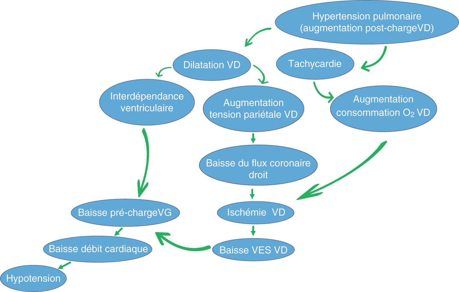 - L’interdépendance ventriculaire se caractérise comme une réduction de la précharge ventriculaire gauche consécutive à une dilatation des cavités droites, à l’origine d’une baisse du débit cardiaque.