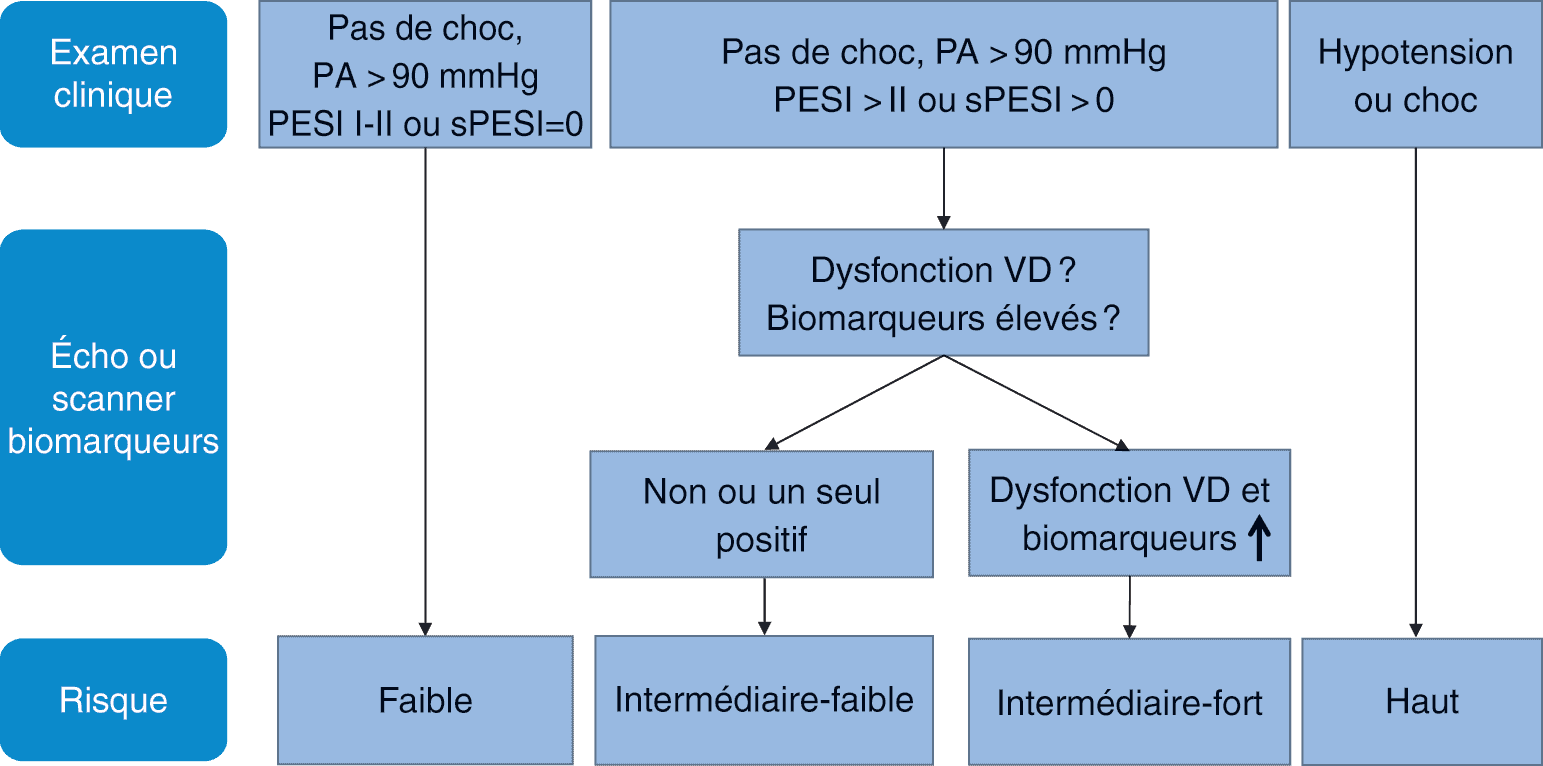 - Un score PESI simplifié a été proposé, prenant en considération (un point par caractéristique) l’âge supérieur à 80 ans, la présence d’un cancer, d’une insuffisance respiratoire ou cardiaque, une pression artérielle systolique inférieure à 100 mmHg, une fréquence cardiaque supérieure à 110 bpm et une SAO2 inférieure à 90 %.
