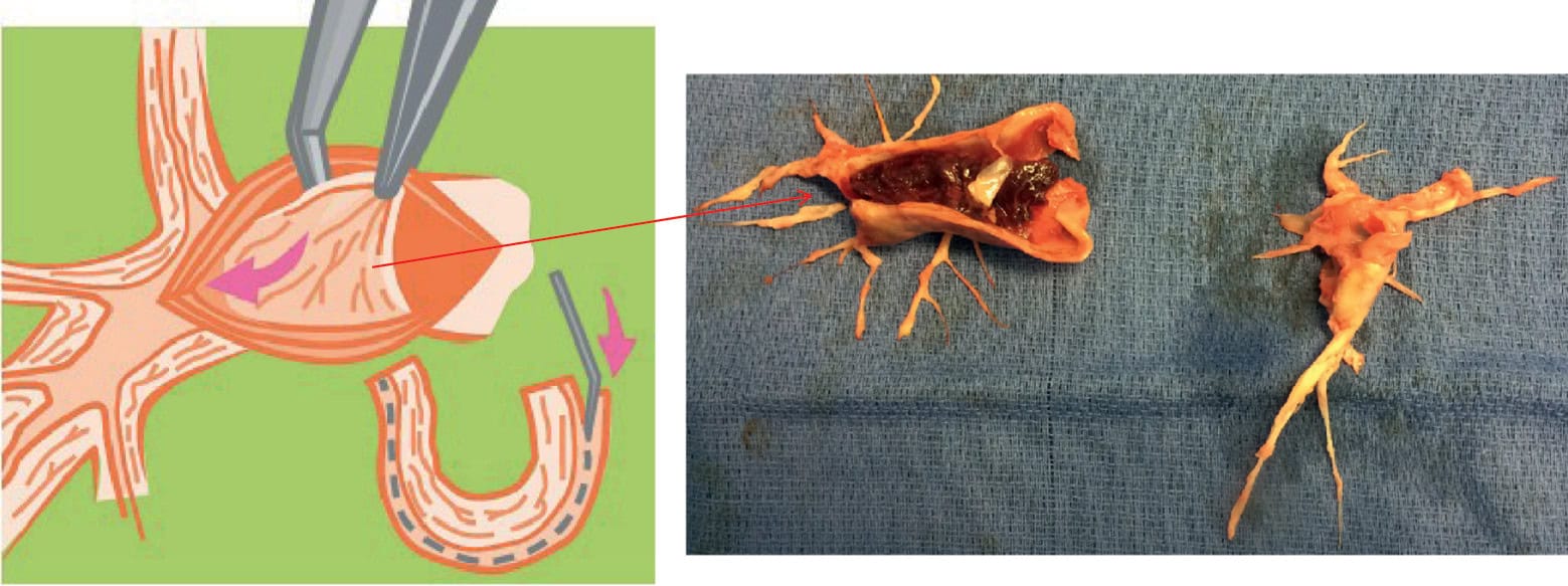 L’artère pulmonaire est ouverte et la chirurgie va « peler » l’intérieur de l’artère pulmonaire afin d’extraire le matériel composé de thrombus fibreux plus ou moins mêlés à des thrombus plus frais.